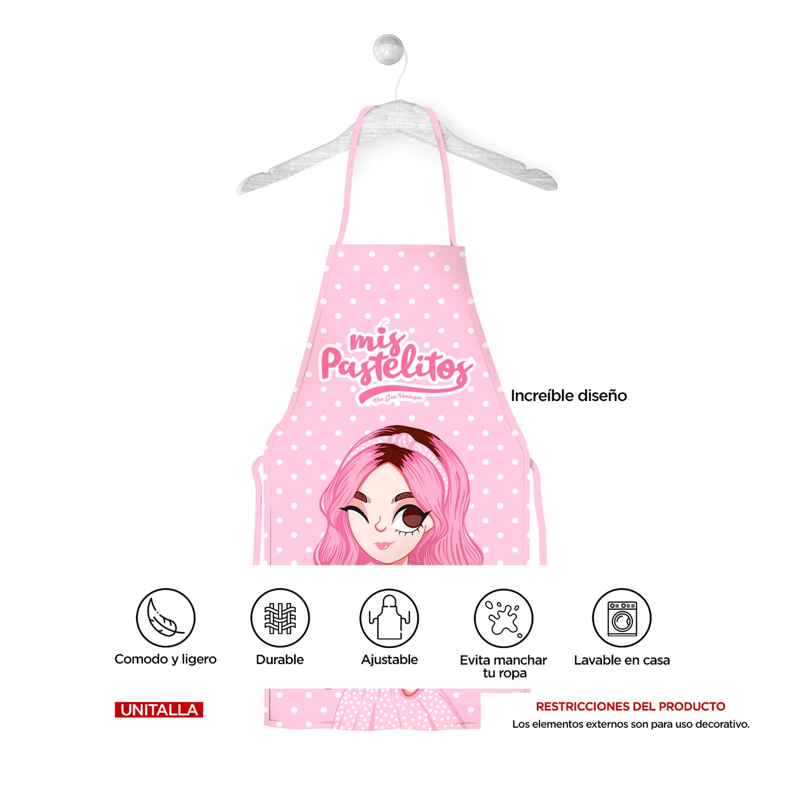 Mandil con lindo diseño MIS PASTELITOS, cuenta con tejido de poliéster, estampado digital material ecológico. Ligero y cómodo perfectos para el uso diario y vivir una experiencia de encanto mientras haces magia en la cocina. Haz que tu pequeña lleve la magia a todos lados.
